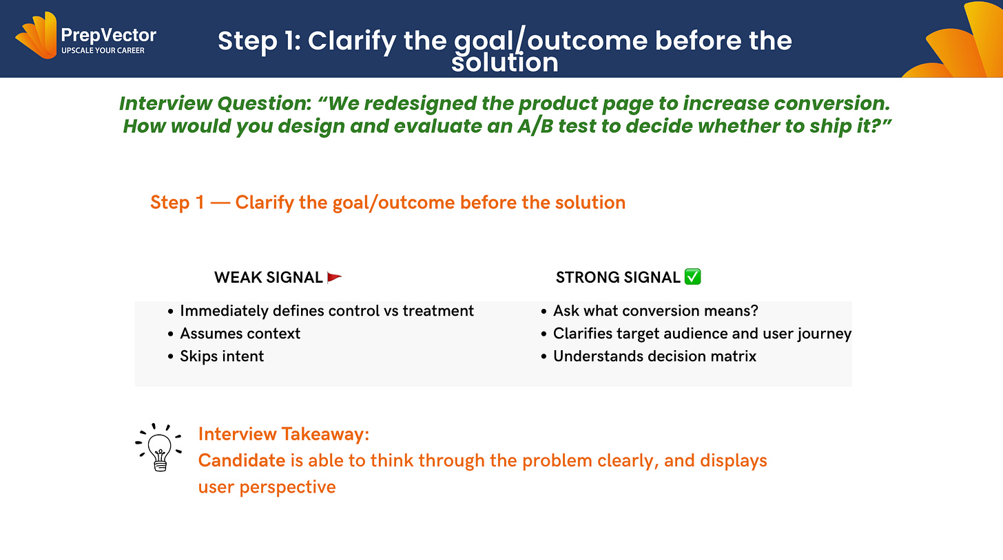 Every strong A/B testing answer starts by understanding why the experiment exists. This step is about clarifying the intended outcome, the user context, and the decision the experiment is meant to unlock.