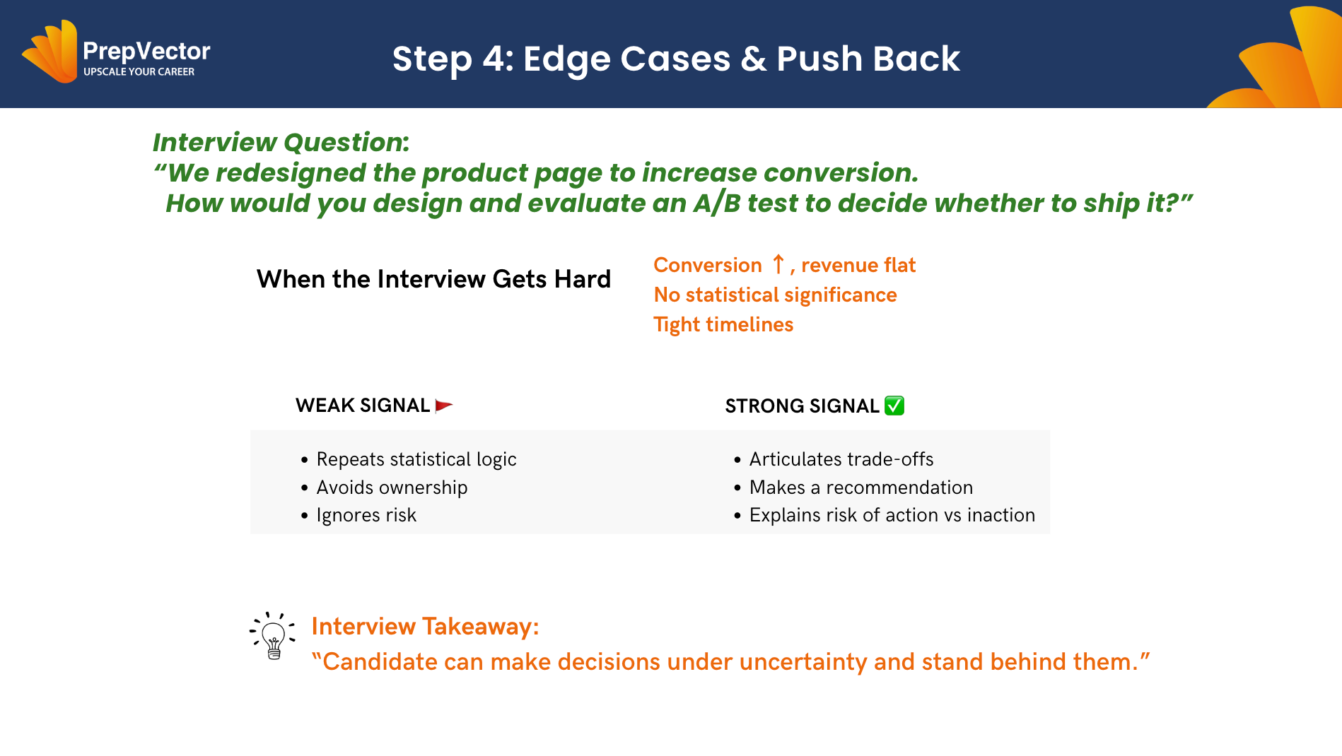 Real experiments rarely produce clean, comfortable results. Interviewers deliberately push candidates into edge cases to see how they respond. This step reveals whether a candidate can think clearly under pressure and ambiguity.