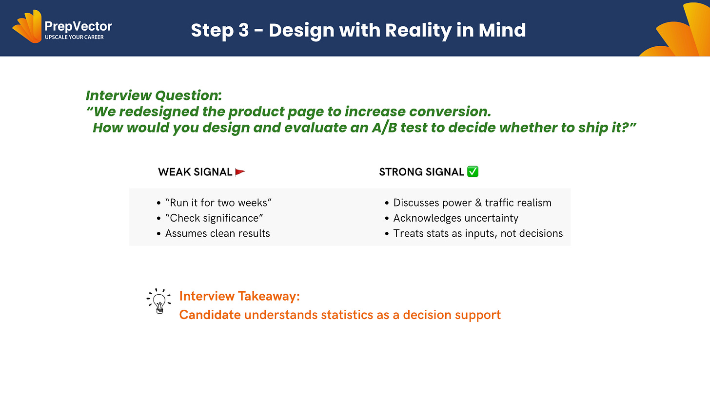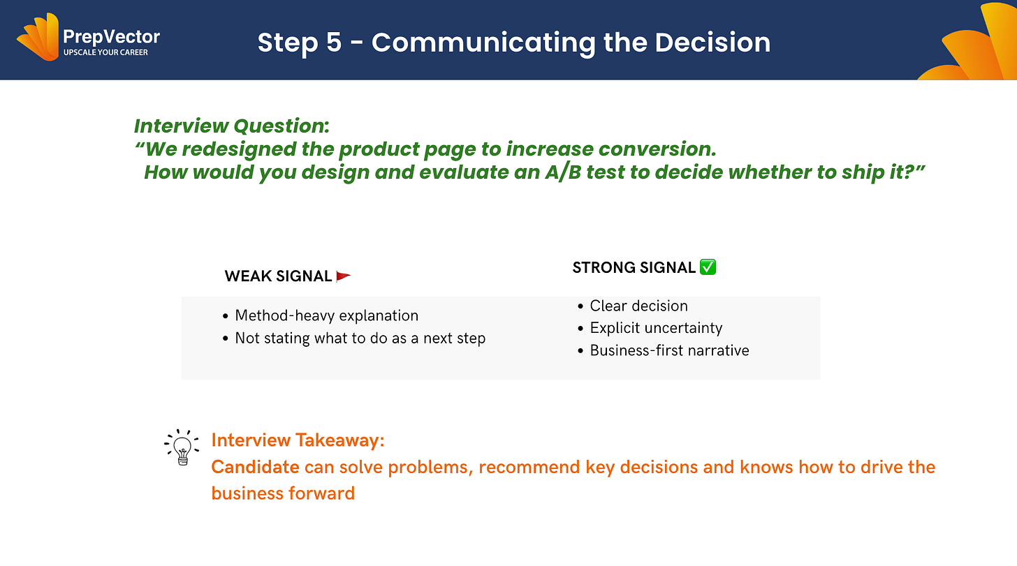 When interviewers ask an A/B testing question, they aren’t looking for a formula. They are looking for structured thinking that leads to a decision. Strong candidates consistently follow a clear mental framework — even if they don’t explicitly label it.