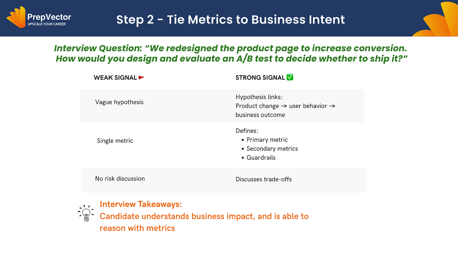 Once the goal is clear, the next step is translating intent into measurable outcomes. This is where candidates demonstrate whether they understand how metrics drive decisions. They define a primary metric, supporting metrics, and guardrails, and explain the trade-offs involved. Metrics are framed as tools for decision-making, not just numbers to report.