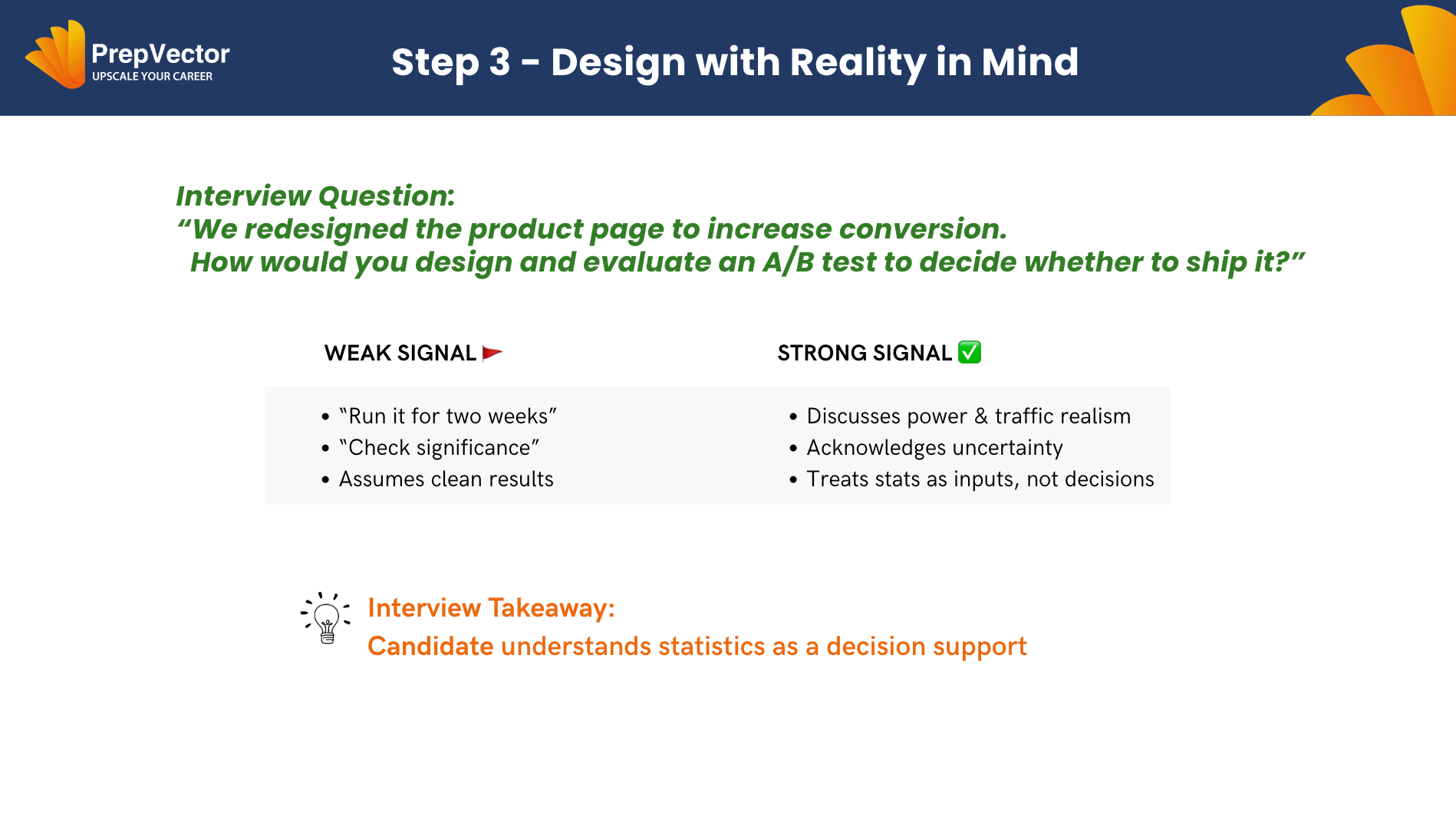 At its core, an A/B testing interview is not about running experiments — it’s about making decisions under uncertainty. Candidates who demonstrate structured reasoning, product judgment, and confidence in their recommendations consistently stand out, long before any formulas come into play.