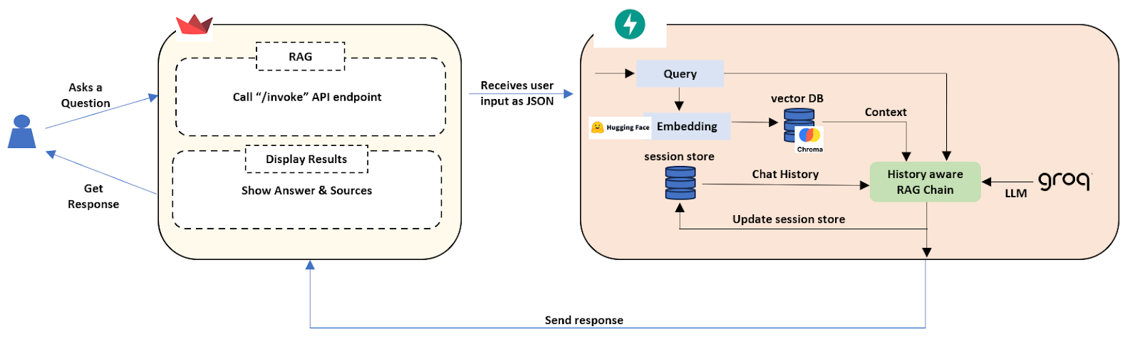Once we have the answer from Groq, we update the conversation history in our memory, adding your question and the chatbot's response. Finally, our FastAPI backend packages up the generated answer and the source content (the specific chunks from your PDF that were used to answer the question) and sends it all back to the Streamlit frontend.