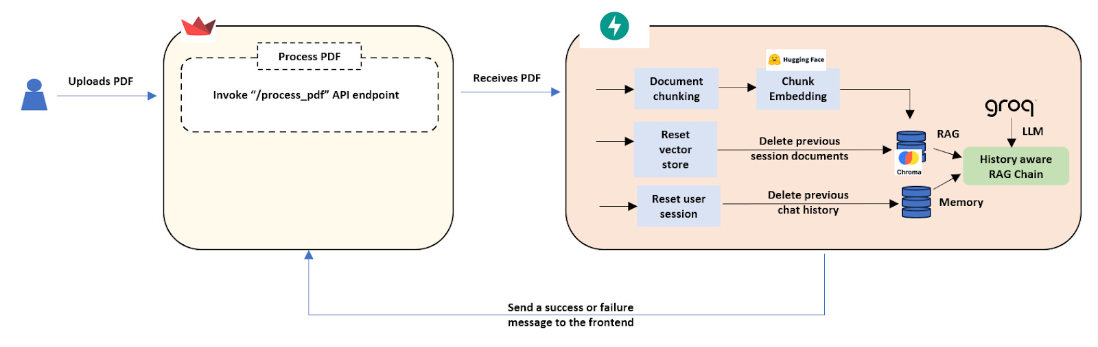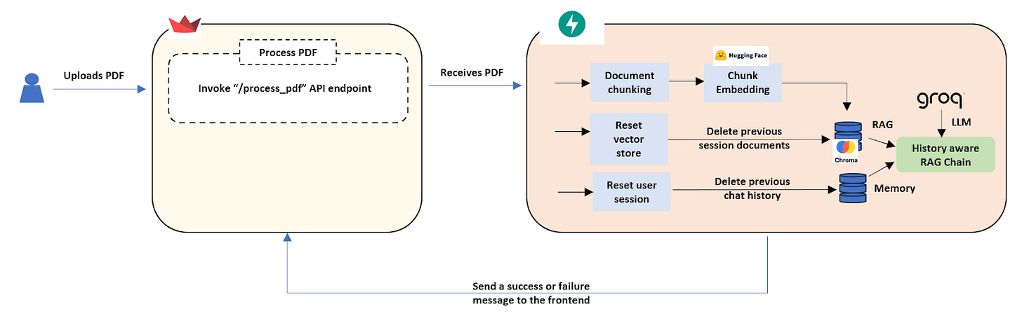 Now comes the crucial part for keeping things relevant: we need to make sure we're focusing on this new document. That's where our vectorstore and document IDs come in. If we've processed a document before, we use the stored document IDs (prev_ids) to tell Chroma to delete the embeddings from the previous file. This ensures our chatbot's knowledge base is fresh and focused on your newly uploaded document. Likewise, we reset our chat history by clearing the content of session store, sessionstore. After clearing the old vector store and session store data, we generate embeddings for the new document using our HuggingFace Embeddings model. Finally, we add these new embeddings, along with their unique IDs, to our Chroma vector store. Once all this processing is done, our FastAPI backend sends a "PDF processed successfully!" message back to the Streamlit frontend, letting you know it's ready for your burning questions!