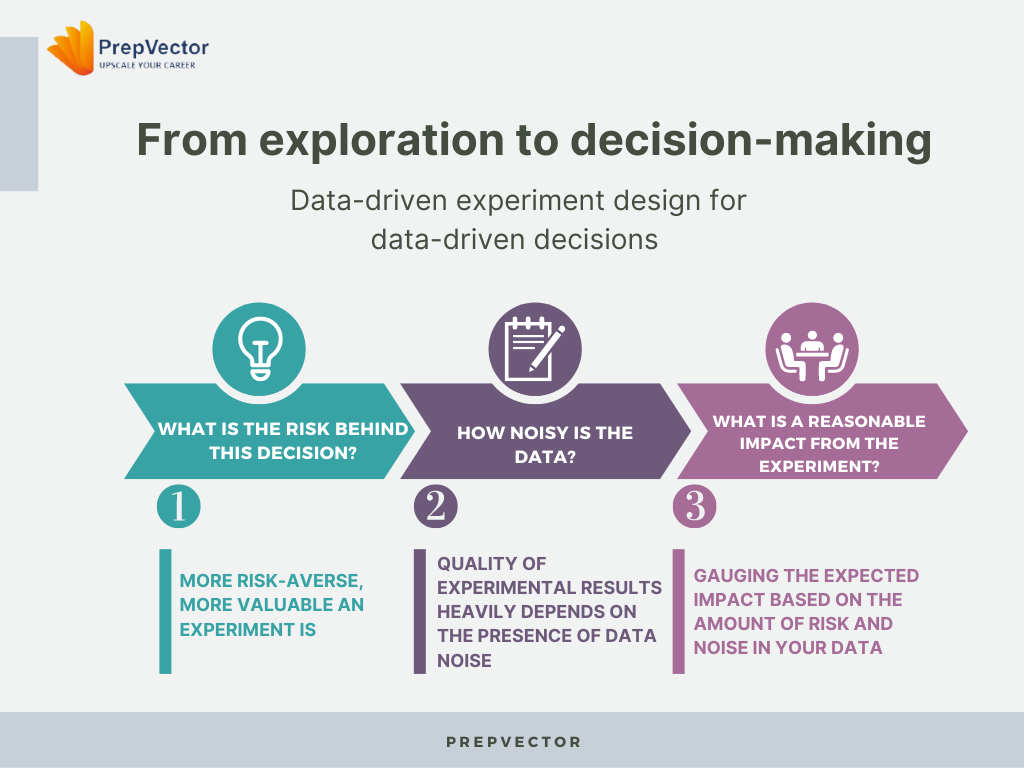 These questions are supported by experimentation science as well. They help formalize your business intuition about your problem space, and scientific knowledge about your data. For example, the risk behind the decision is formalized through knowing your tolerance for making False Positive or False Negative decisions. Dealing with the noise of your data involves sampling methods or predictive machine learning models, and the reasonable impact uses one of the core tools of experimental design, the power calculation.